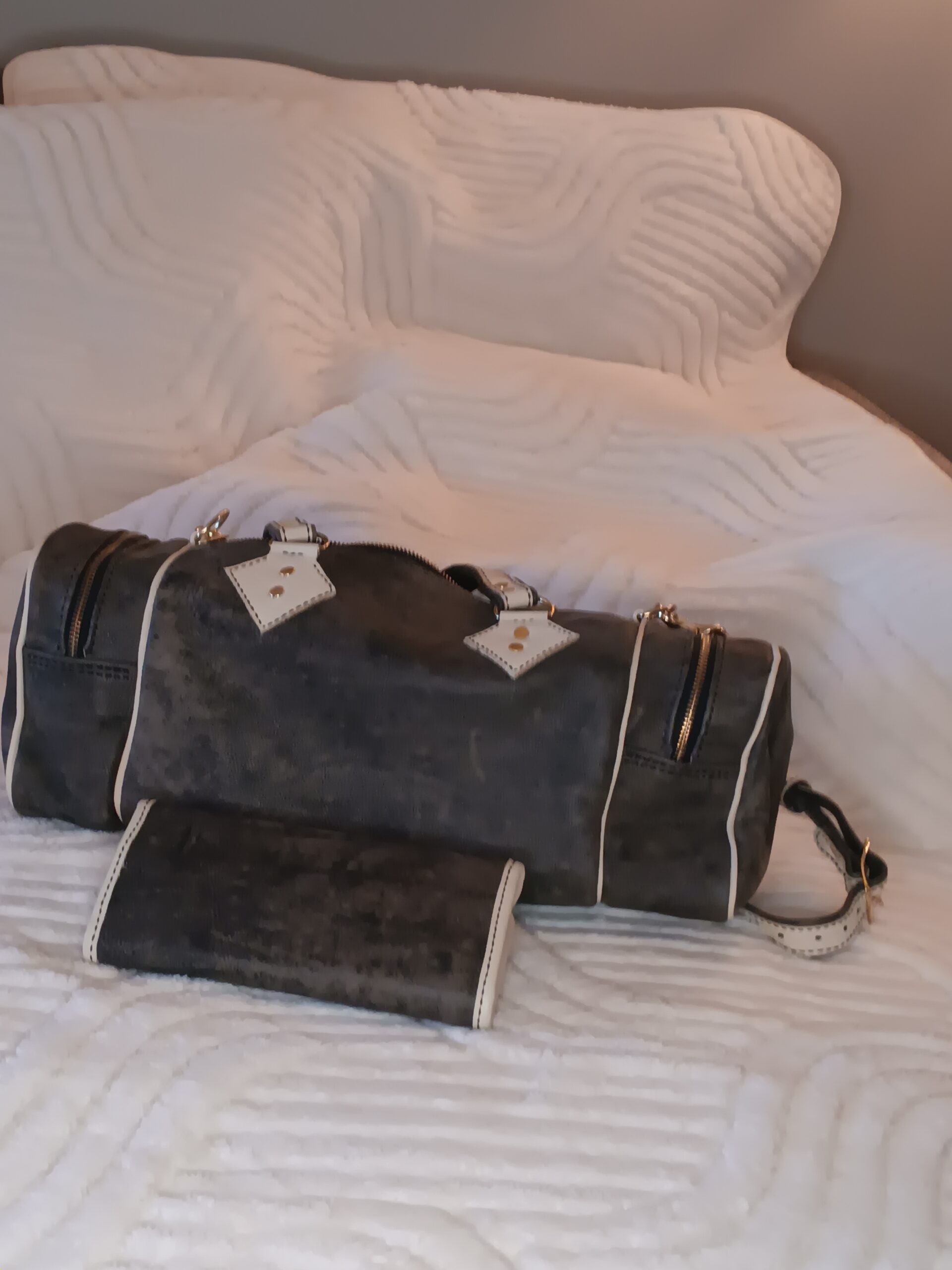 This handcrafted duffle bag set is made from premium genuine leather, combining soft gray suede with refined bone-tone leather accents for a timeless and modern look. Designed for both style and functionality, the duffle bag offers a spacious interior suitable for travel, gym use, or daily carry, while maintaining a structured and polished silhouette.